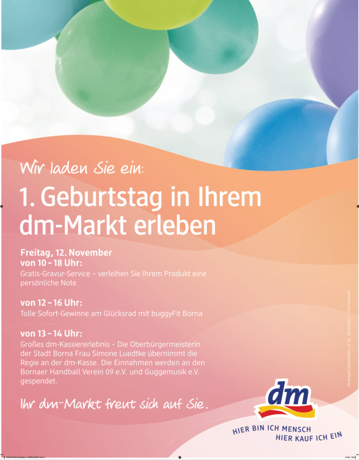 Aufgepasst!!! am 12.11.2021 kommt alle fleißig einkaufen .Den Erlös aus dem Verkauf im Zeitraum von 13:00 – 14:00 Uhr spendet der DM Markt anlässlich des 1.Geburtstags dem Handball und Guggeverein